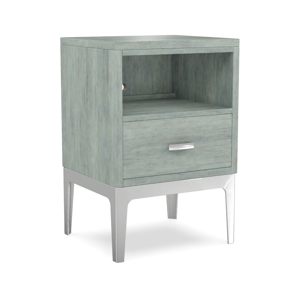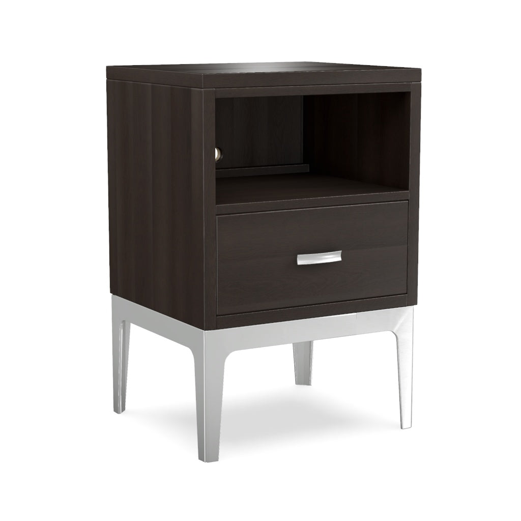 Strong and sleek. Classy and contemporary. Defined and distinguished. This minimalistic group combines a brushed stainless steel base with a solid wood construction. The recessed base allows for versatile placement of the cases for multiple configurations to suit the needs of the consumer. A sculptured, concave bar pull completes the case pieces, adding an architectural elegance.