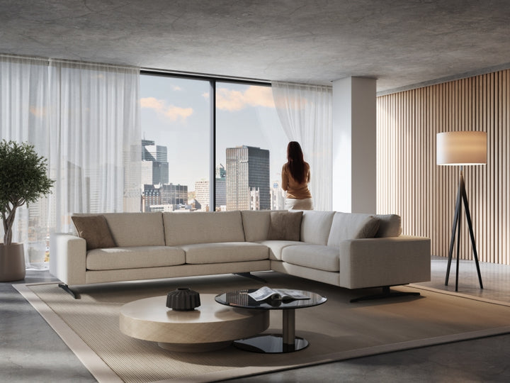 Chic European style collection that features a low profile frame and steel base that gives the impression that the piece is floating. The optional wood base changes up the look for a rich and and warm anchor for your space. Choice of different cushion fills, hundreds of fabrics, and multiple sizes provides thousands of potential configurations to suit your personal style and space. The bolster on the back not only provides exceptional comfort and support, but is a distinctive decorative element that makes this collection look great from all angles. For an extra design touch, the bolster can be upholstered in a contrasting fabric making your sofa a truly distinct statement of your style.
