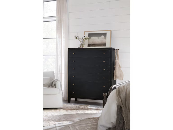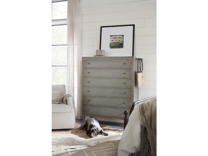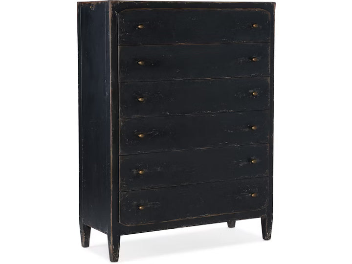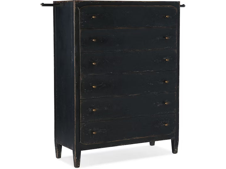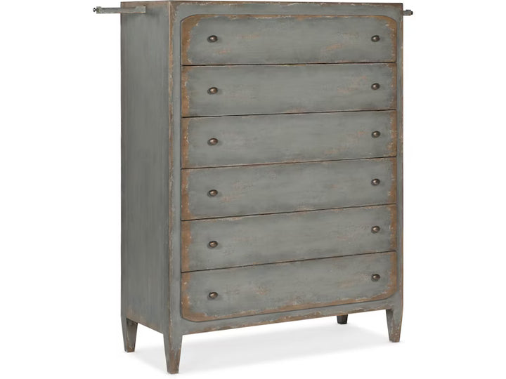 Inspired by European farmhouses, the 6-drawer Ciao Bella Chest reflects a simpler lifestyle. The exquisite finish with multi-layer rub-through makes the chest look like it is been passed down through generations. A pull-out garment rod on either side of the case just above the top drawer provides a convenient space to hang frequently-used items or to lay out your clothes for early-morning departures. There is a drop-in felt liner in the top drawer, and the bottom drawer is cedar lined. Burnished brass hardware adds the finishing touch of style. Inspired by the small farmhouses that dot the French and Italian countryside and have been in the hands of the same family for generations, Cottswood Interiors introduces the rustic Ciao Bella Collection. The whole home collection is an eclectic mix of European farmhouse pieces that have the appearance of furniture that has been refinished multiple times as it has passed through the generations. Ciao Bella includes bedroom, dining room, occasional, home office and accent furniture, and features a Soft Black finish or Timeworn Gray finish that accentuate the historical nature of European farmhouses – many of which include a variety of furniture styles that have been added by each generation of owners.