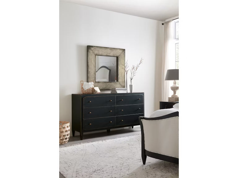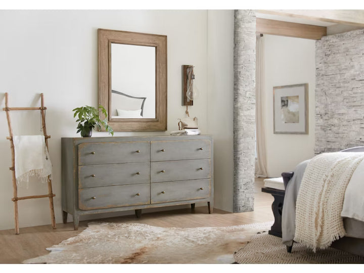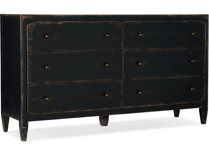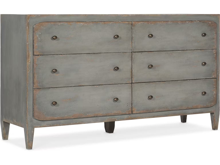 Rustic and romantic, the six-drawer Ciao Bella dresser will bring a European farmhouse ambience to your room. Crafted of Poplar and Hardwood Solids with Maple Veneer, the exquisite finish has multi-layered rub-through and is filled with character. The top 2 drawers have a drop-in felt liner, the bottom drawers are cedar-lined and there is a sliding/removable jewelry tray in the top right drawer. Inspired by the small farmhouses that dot the French and Italian countryside and have been in the hands of the same family for generations, Cottswood Interiors introduces the rustic Ciao Bella Collection. The whole home collection is an eclectic mix of European farmhouse pieces that have the appearance of furniture that has been refinished multiple times as it has passed through the generations. Ciao Bella includes bedroom, dining room, occasional, home office and accent furniture, and features a Soft Black finish or Timeworn Gray finish, that accentuate the historical nature of European farmhouses – many of which include a variety of furniture styles that have been added by each generation of owners.