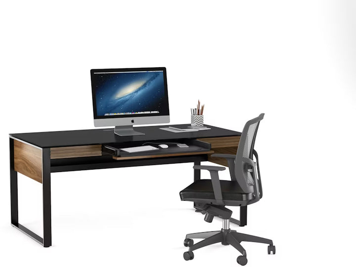 The clean lines and refined styling of the Corridor 6521 Executive Desk is not only pleasing to the eye but is engineered and designed to keep you organized, efficient, and inspired. Topped with a durable soft-to-the-touch satin-etched tempered glass, the 6521 includes a hidden flip-front keyboard drawer, cable management channels, and a modesty panel for comfortable cross-desk collaboration. The keystone of the Corridor Office collection, the impressive styling of the desk commands respect.