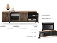 Features: Soundbar Platform, Remote-Friendly Doors, Adjustable Shelves, Rear Access Panels, Flow-Through Ventilation, Cable Management, TV Safety Strap, Wire Management Wraps, Soft-Close Doors, Internal Leveling System, Acoustically Transparent Doors