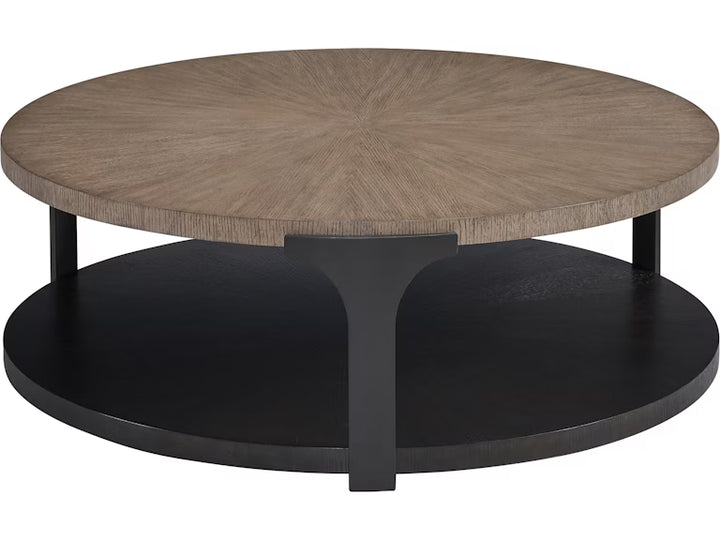 Product Description Radial matched veneered top in Senegal finish. Base in contrasting Tunis finish. Three metal perimeter legs.