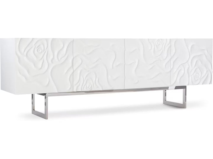 Product Description Rectangular entertainment credenza with exterior in White Plaster finish. Unfinished back panel painted white. Interior in Lacquered White paint. Four soft-closing doors with White Plaster dimensional floral design on fronts. Behind each left and right door is one adjustable/removable shelf and one hole with covered grommet. Behind paired center doors are one drawer with hand-pull cutout and Bernhardt name plate, one adjustable/removable shelf and one hole with covered grommet. Polished Stainless Steel base. Adjustable glides. Anti--tip kit