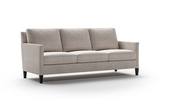 A curved welted detail wraps this slender track arm, on a small scale frame. Eco-friendly construction. Certified sustainable, kiln-dried wood frame. Bench made in Canada.